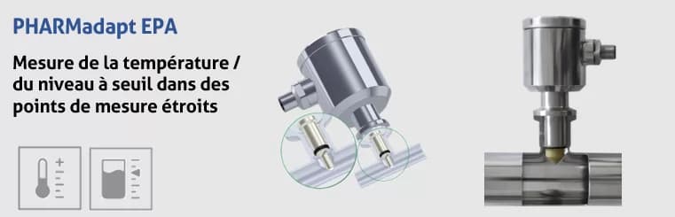 PHARMadapt EPA – mesure de température et détection de niveau de seuil pratiquement sans espace mort dans les tuyaux à partir de DN10. L’étanchéité par rapport au processus est assurée par un joint torique.